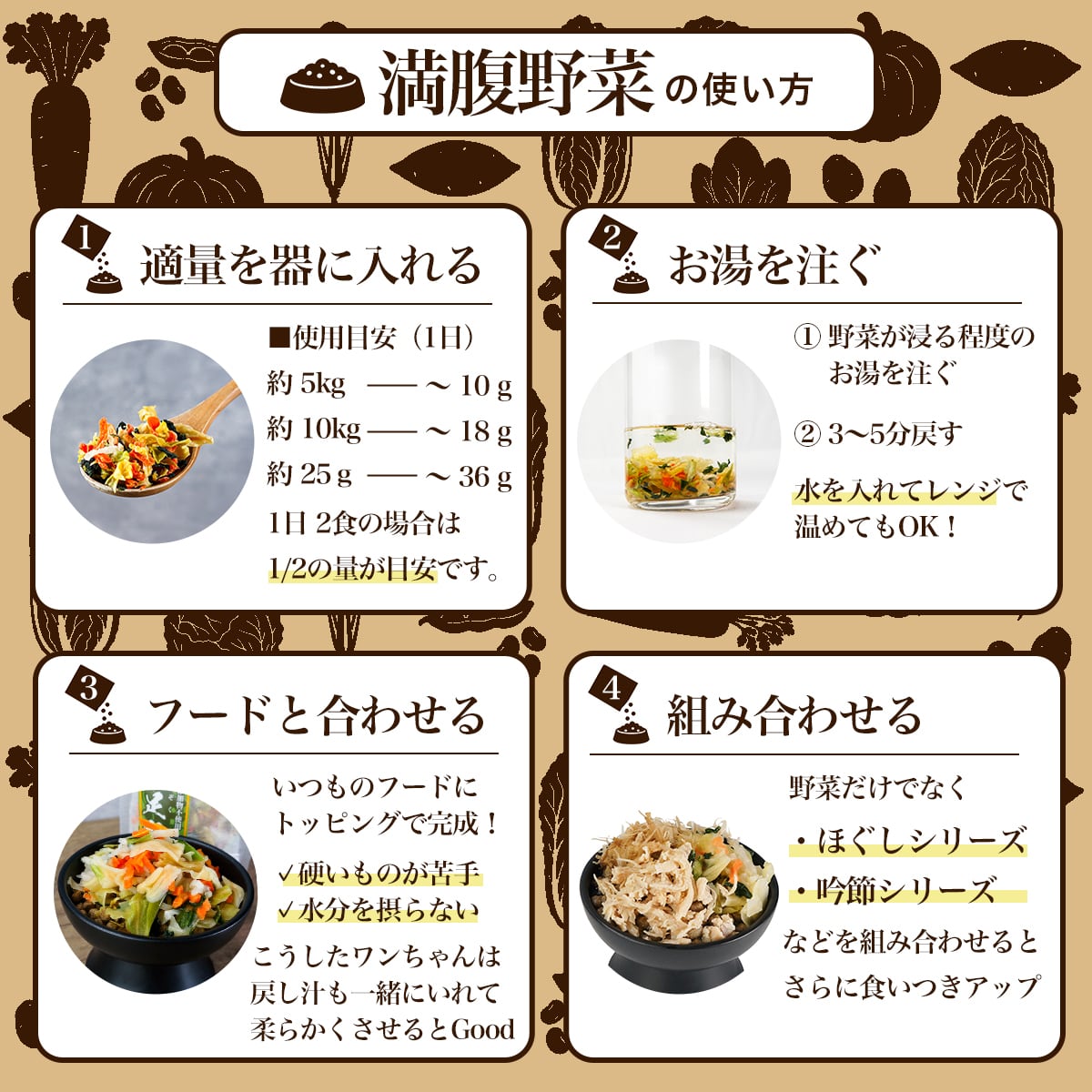 『ふりかけ専門店 犬乃馳走屋』の満腹野菜ふりかけは、国産キャベツ・にんじん・小松菜・大根の4種を贅沢にブレンド。