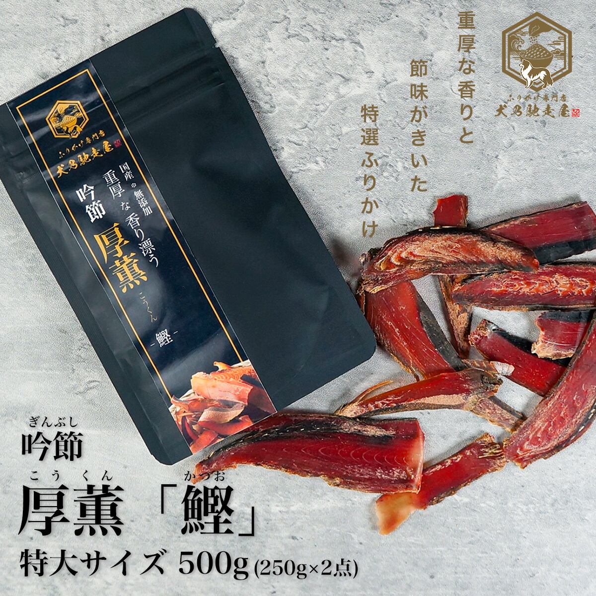 『ふりかけ専門店 犬乃馳走屋』の吟節 厚薫 - 鰹は、国内工房で丁寧に仕上げた、国産・無添加・ヒューマングレードの厚削り鰹節です。