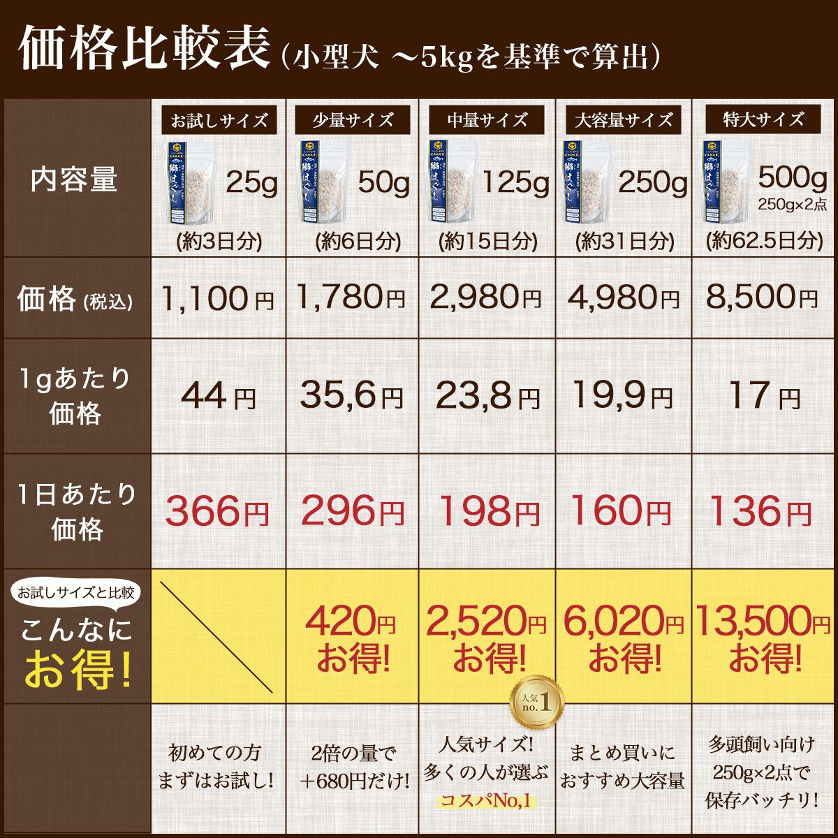 初めて与える場合は半分程度からスタートし、わんちゃんの様子を見ながら調整してください。万が一、体調に変化が見られた場合は、直ちに与えるのを中止してください。