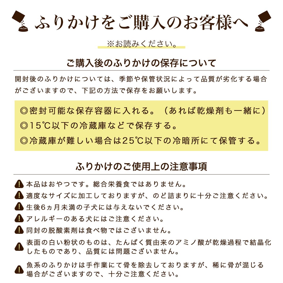 ・完全無添加のため、開封後は直射日光・高温多湿を避け、冷蔵庫で密封保管しお早めに与えてください。
