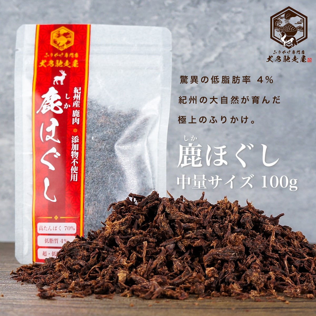 『ふりかけ専門店 犬乃馳走屋』の鹿ほぐしふりかけは、紀州の自然豊かな山々で育った上質な国産鹿肉を使用。