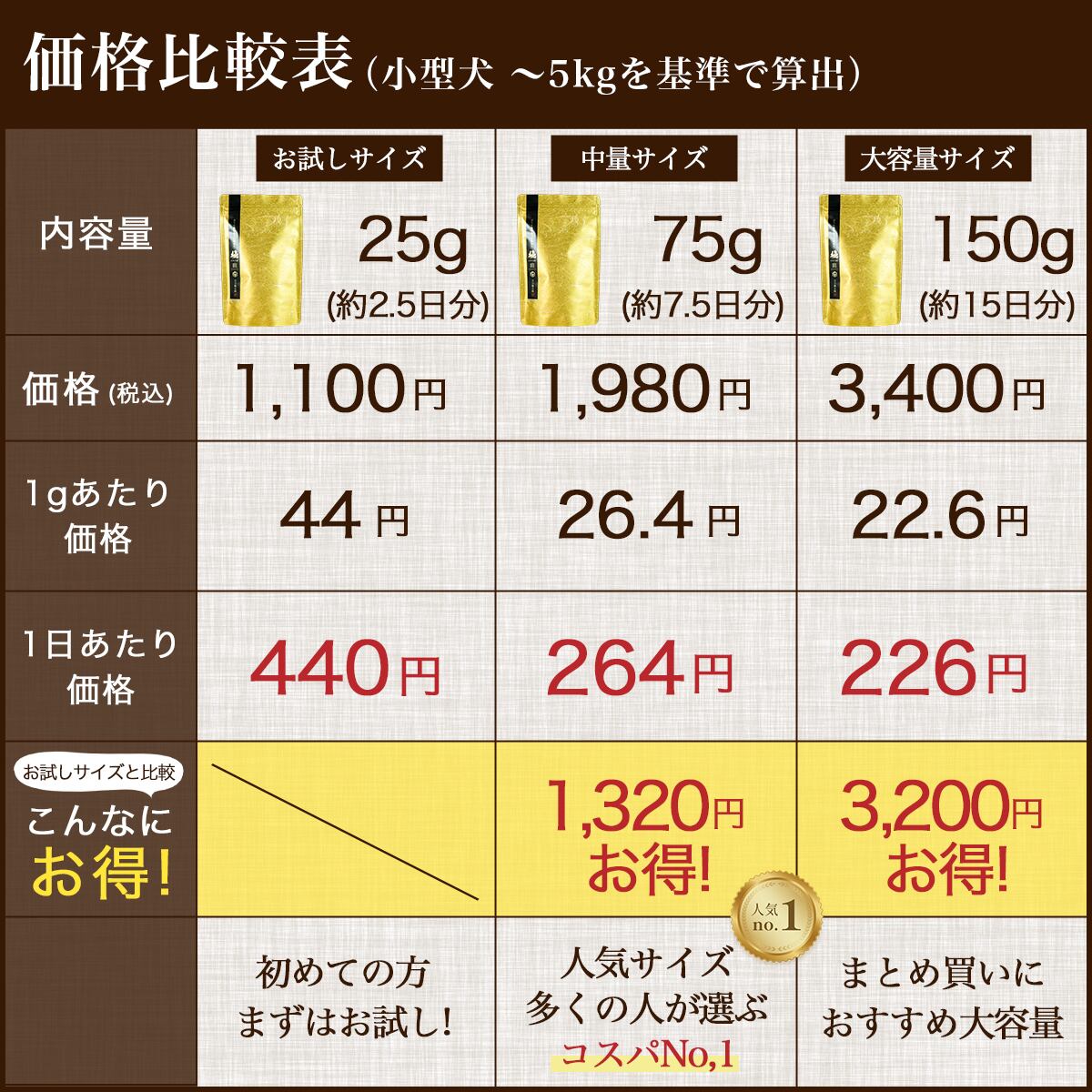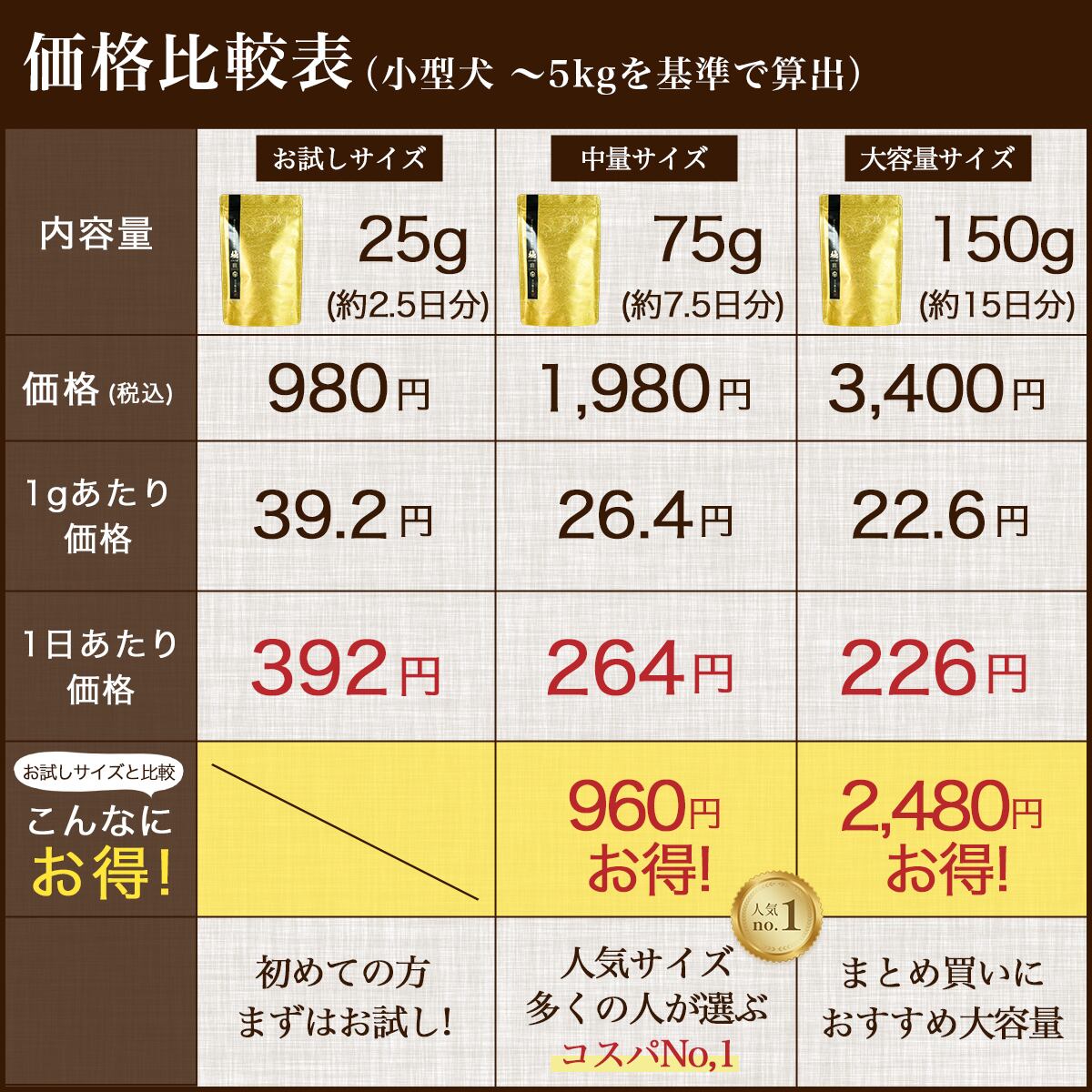 初めて与える場合は半分程度からスタートし、わんちゃんの様子を見ながら調整してください。万が一、体調に変化が見られた場合は、直ちに与えるのを中止してください。