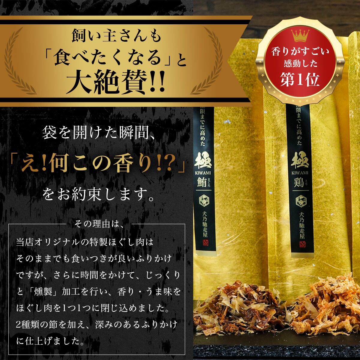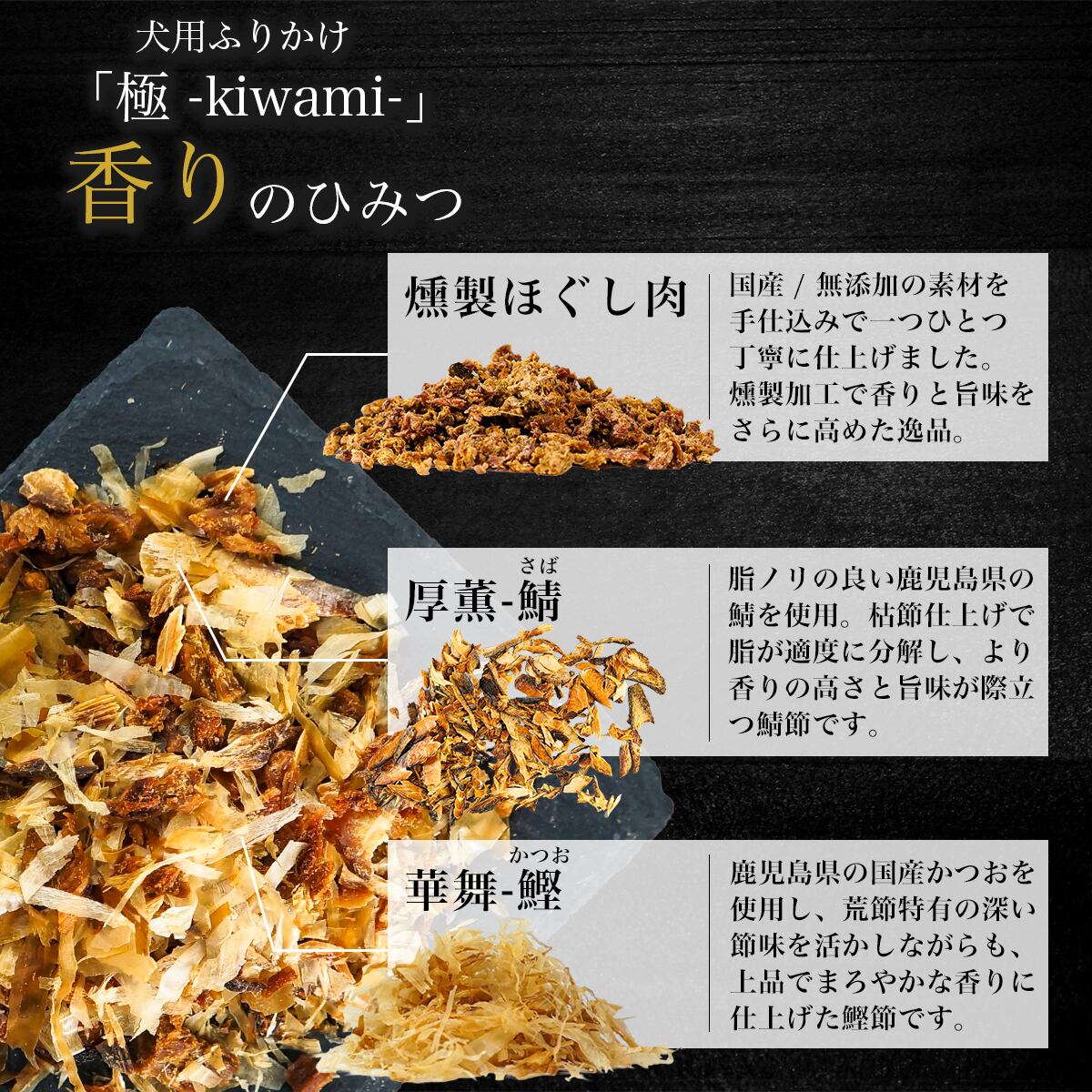 極-kiwami-は、低温乾燥で旨味を凝縮した特製ほぐし肉に、燻製の香りをまとわせ、さらに厳選した枯節さばと荒節かつおを重ねました。