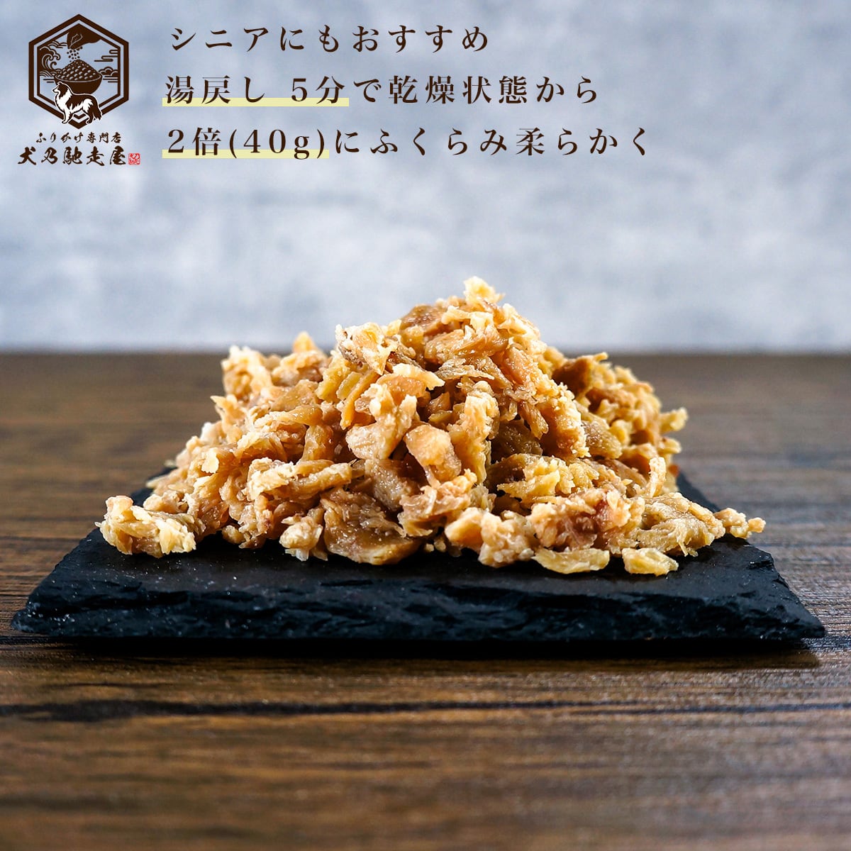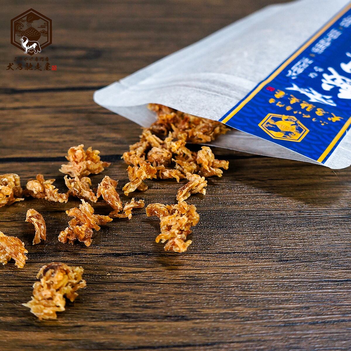 『ふりかけ専門店 犬乃馳走屋』の鮫ほぐしは、日本有数の気仙沼産 新鮮なサメ肉だけを使用し、一つひとつ丁寧に手作業でほぐしました。